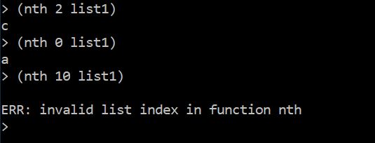 As you can see, it is possible to access an element of the nested list in two ways. The last example shows how we can directly use a list literal in the first argument position.
